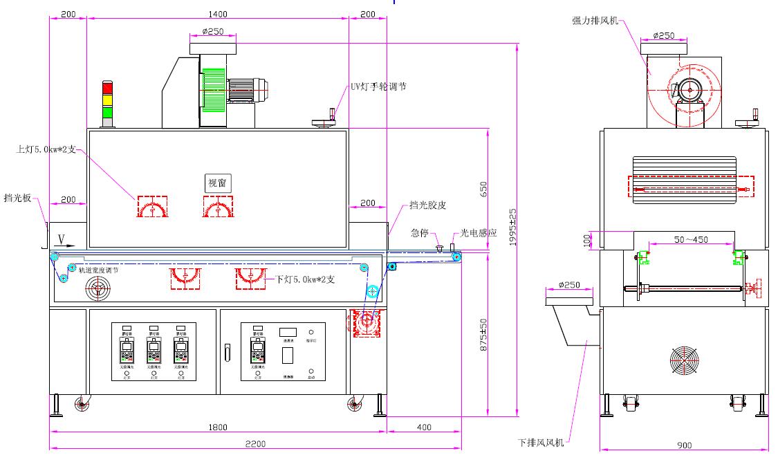 | 1、UV燈功率:5.0kw*4支(UV汞燈) | 2、UV燈總長:620mm、弧長:500mm |