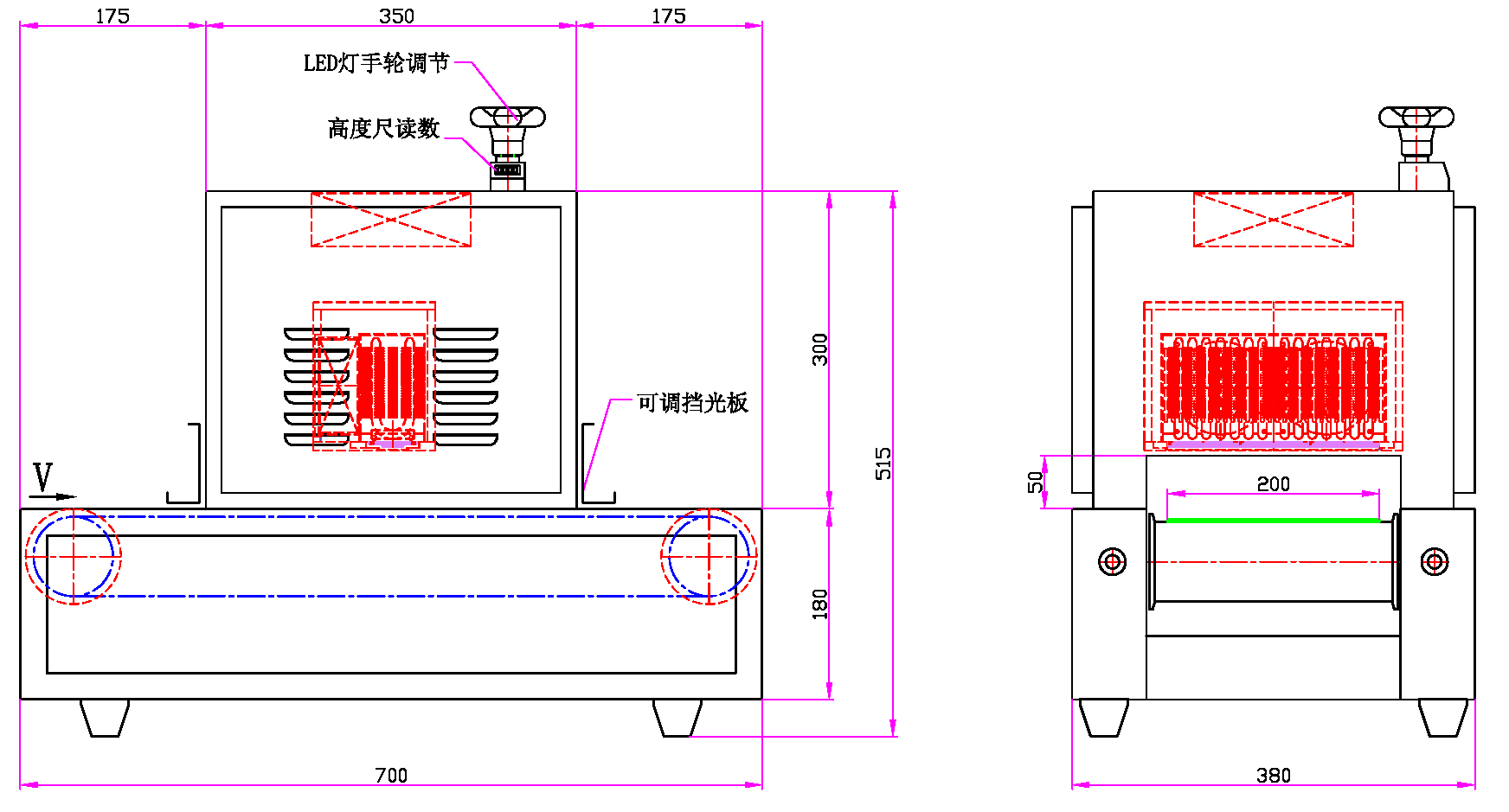 5、LED燈組高低手輪調節 6、輸送材料:特氟龍網帶