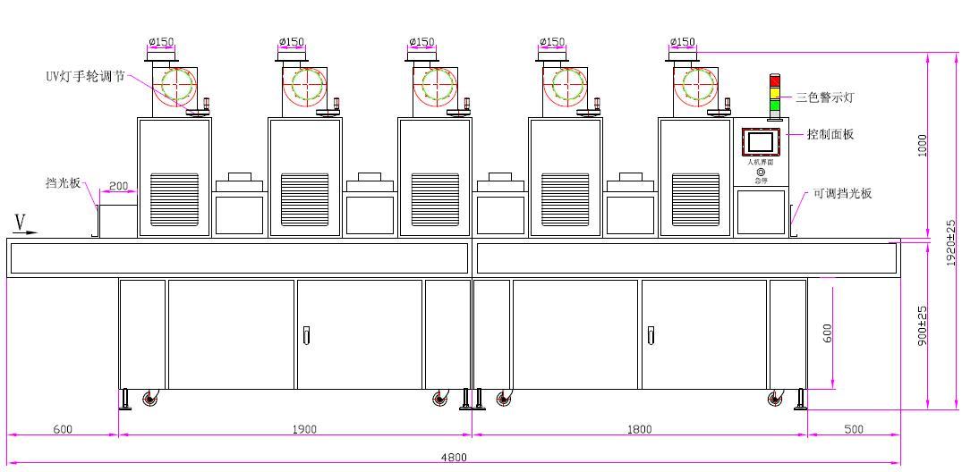 | 1、UV燈功率:6.0kw*5支(鹵素燈) | 2、UV燈總長:620mm、弧長:500mm |